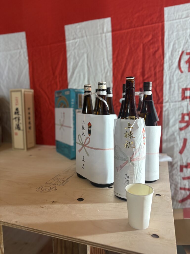棟上げ(建物の骨組みの組み上げ)は前日に完了しており、この日は棟梁によるお清めの儀式からスタート。建物の守護神と工事の無事を感謝し、祈る儀式が行われました。
