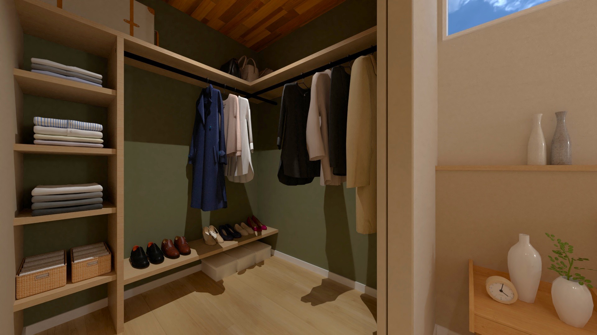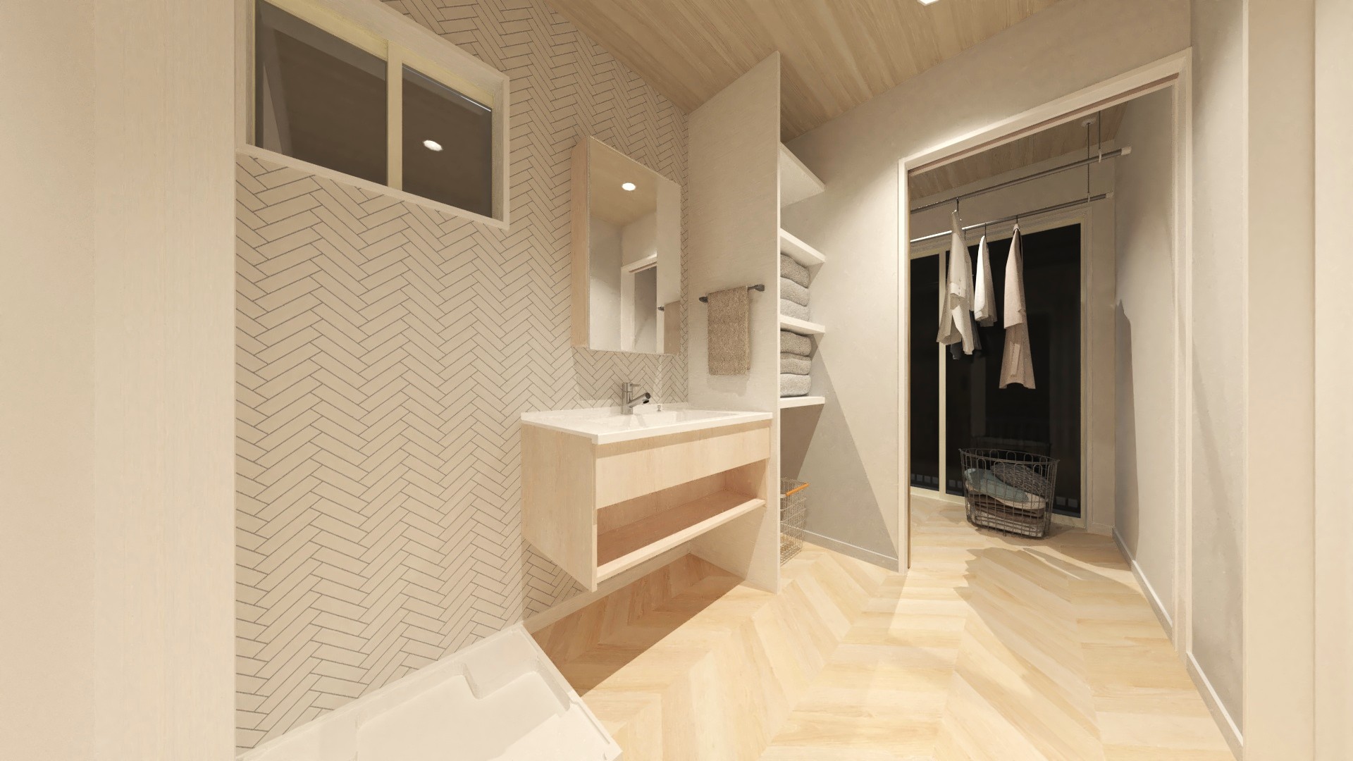 忙しい毎日にゆとりをくれる家事動線。収納付きの洗面脱衣室のすぐ隣には、天気を気にせず干せるサンルームを完備。重い洗濯物を持って移動する手間はもうありません。