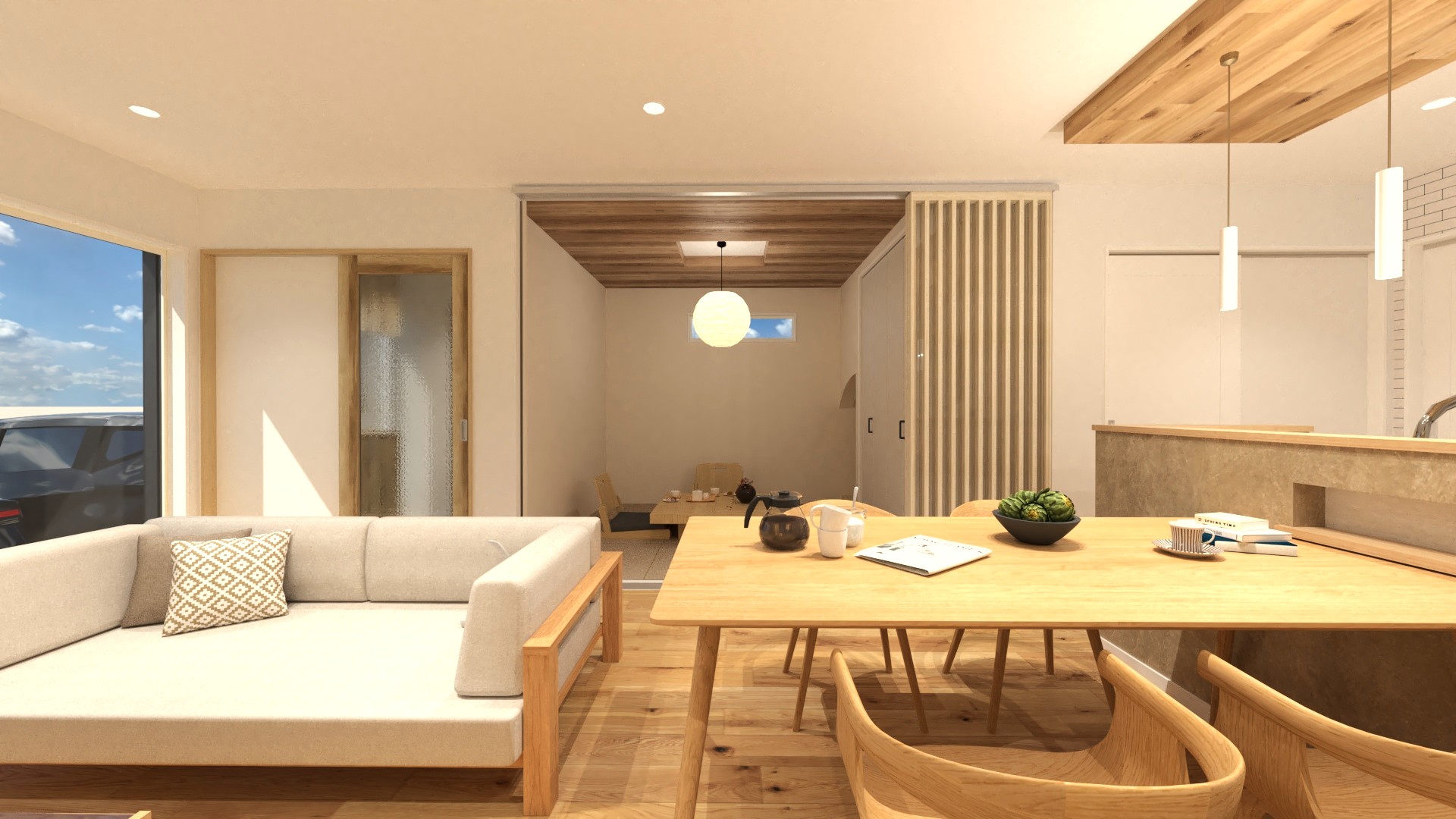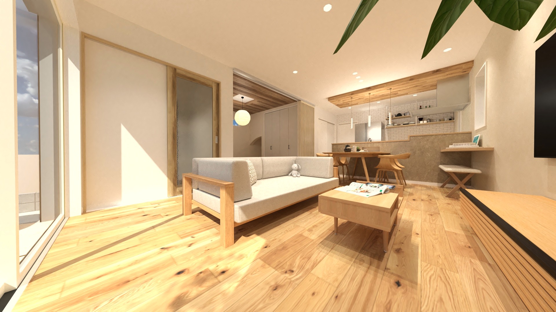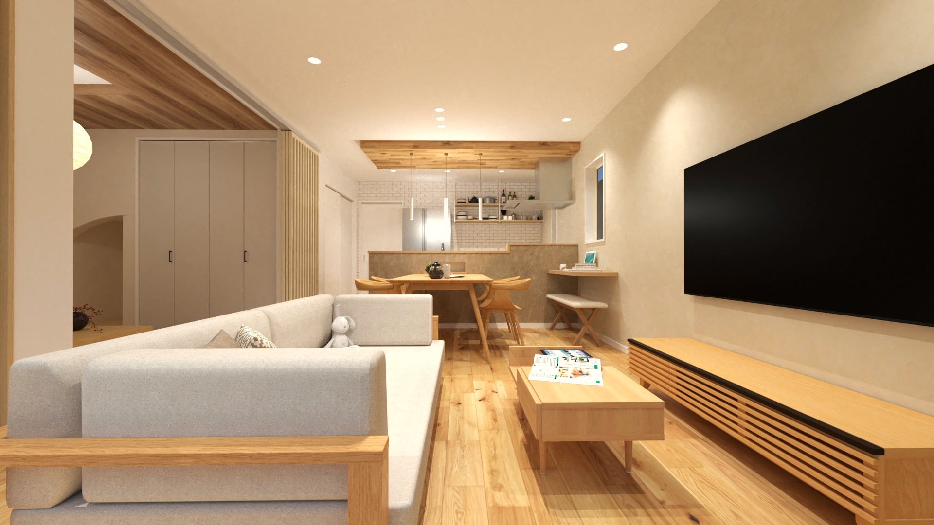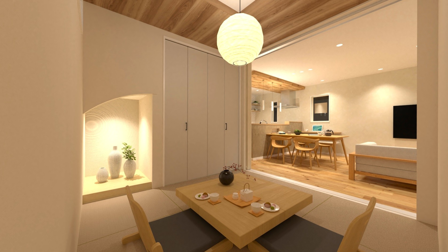 16帖の広々としたLDK!隣接する4.5帖の和室を開放すれば20帖超の大空間としてお使いいただけます。キッチンから目が届くので、和室はお子様のお昼寝や遊び場にも最適です。