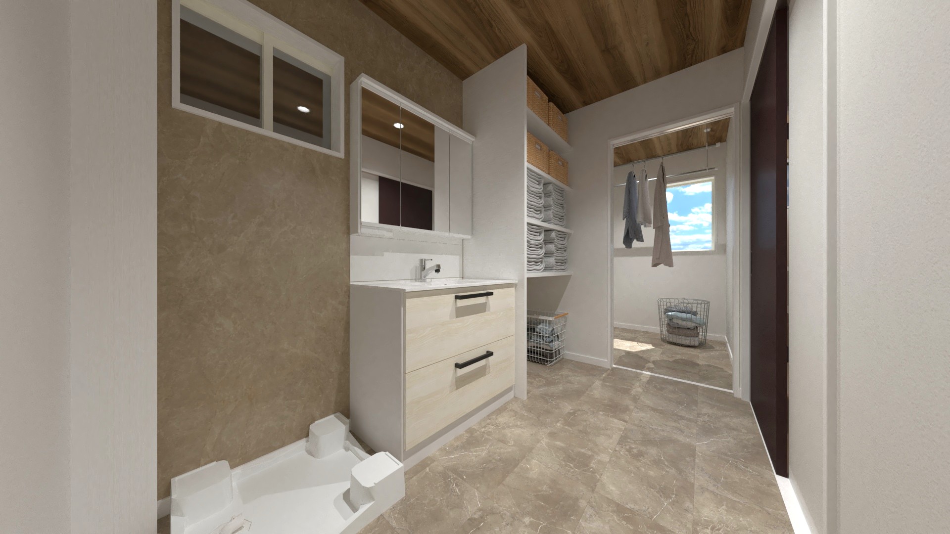 水廻りをまとめ、室内干しスペース付きのサンルームを隣接させたストレスフリーな家事動線も大きな魅力。雨の日でも安心して洗濯ができ、毎日の家事負担を大幅に軽減します。