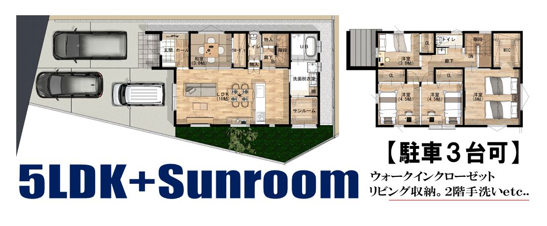 ストレスフリーな暮らしを叶えるプラン!忙しい毎日をサポートする「家事ラク」設計を徹底しました。水廻りを集中配置し、さらに室内干しスペースとして便利なサンルームを併設しました。