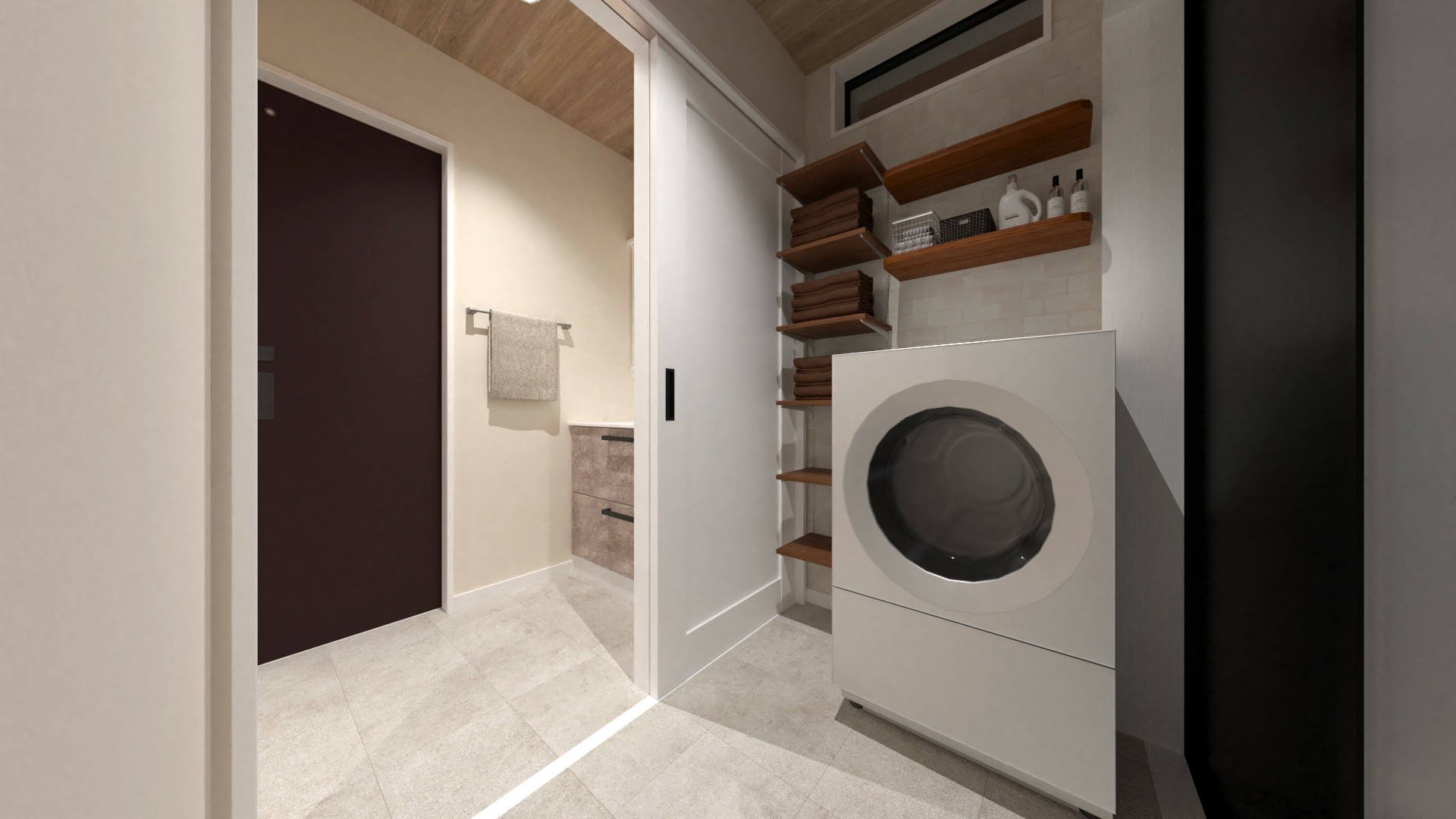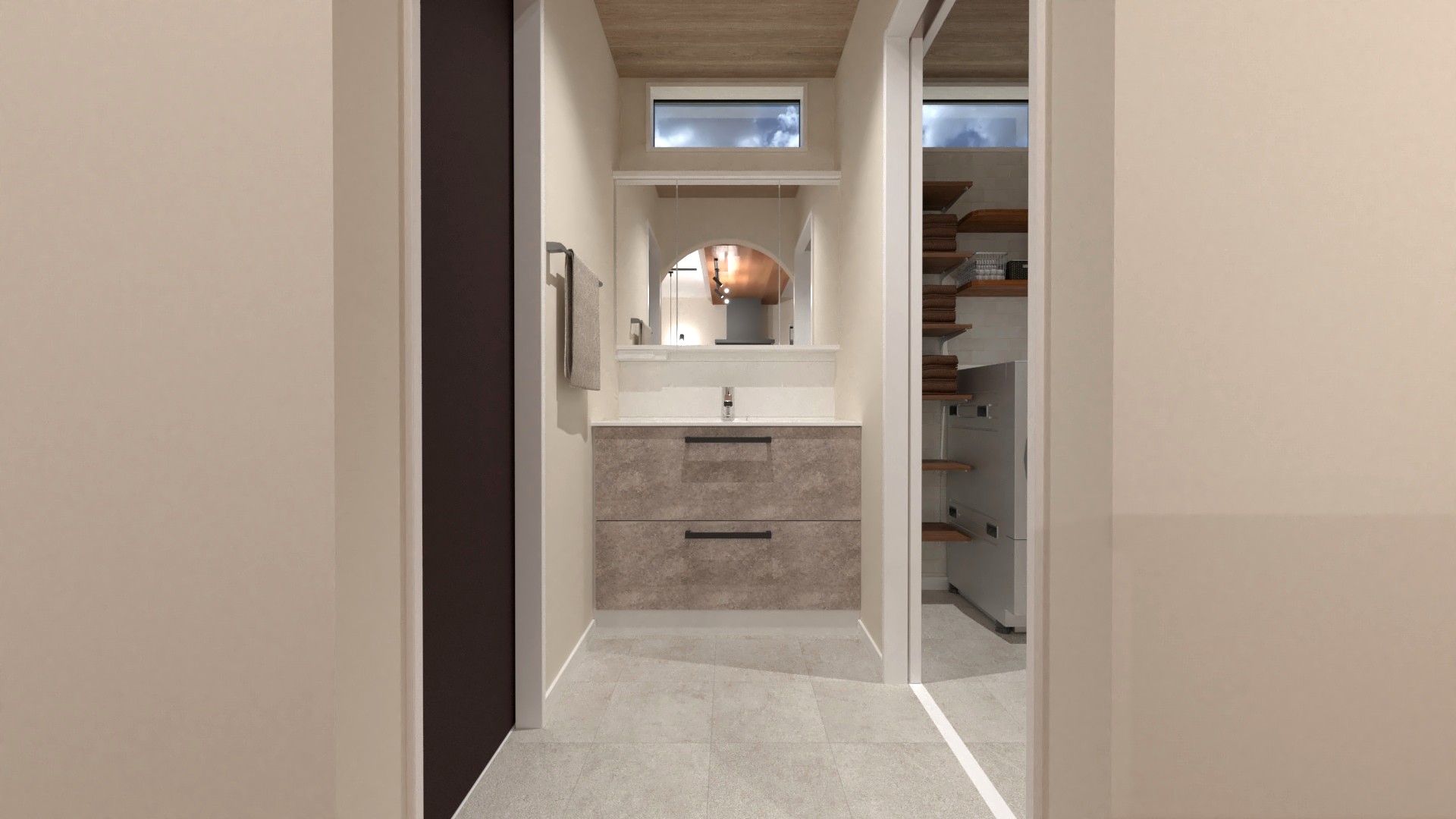 忙しい朝のバタバタを解消するため、洗面台と脱衣室をあえて分離しました。誰かが入浴中でも気兼ねなく身支度が整えられます。