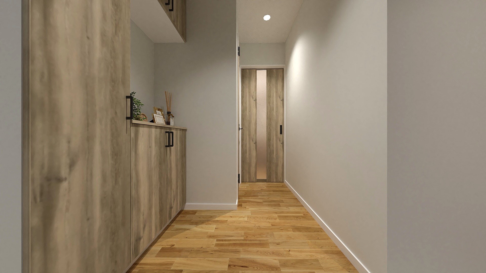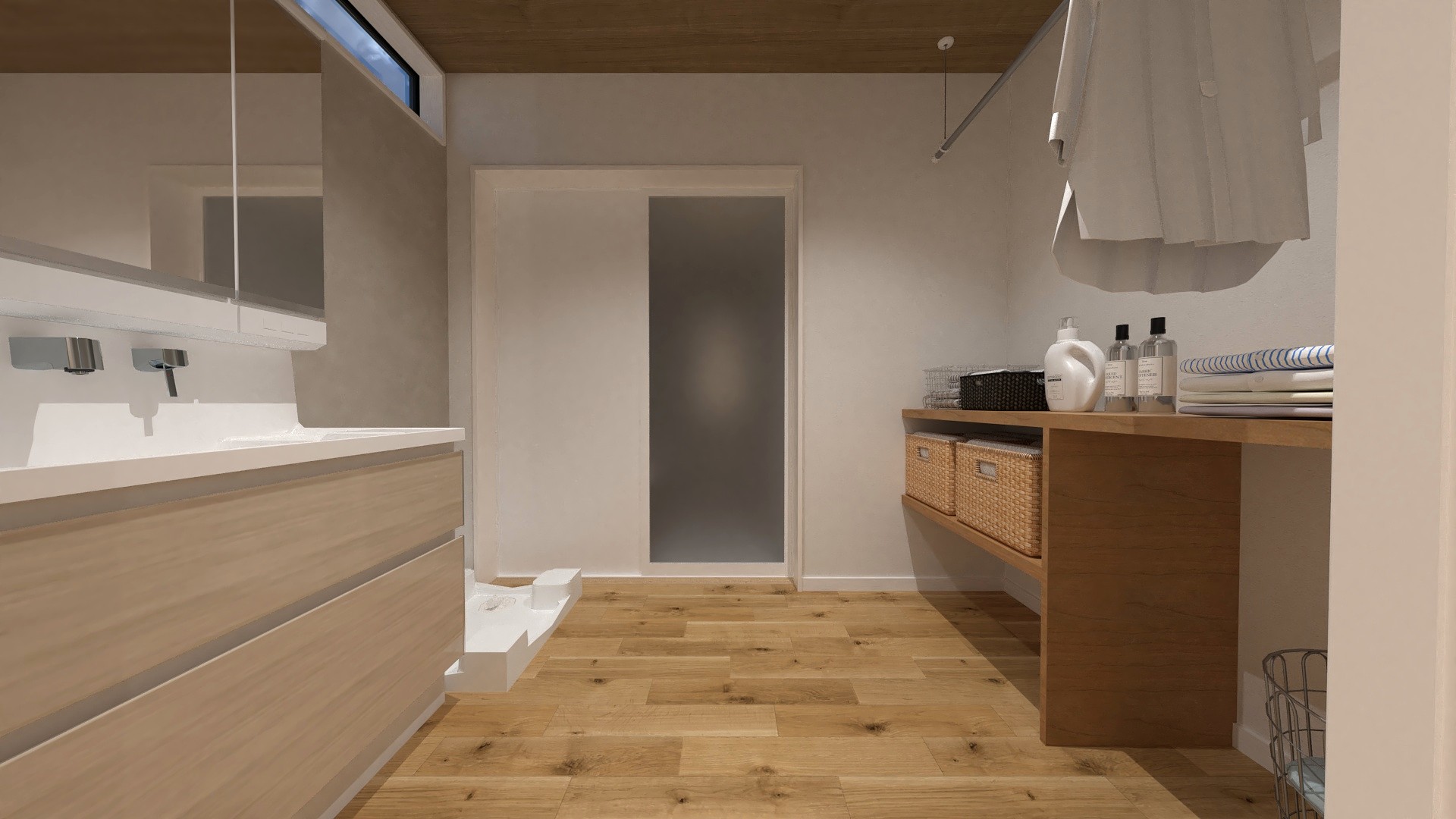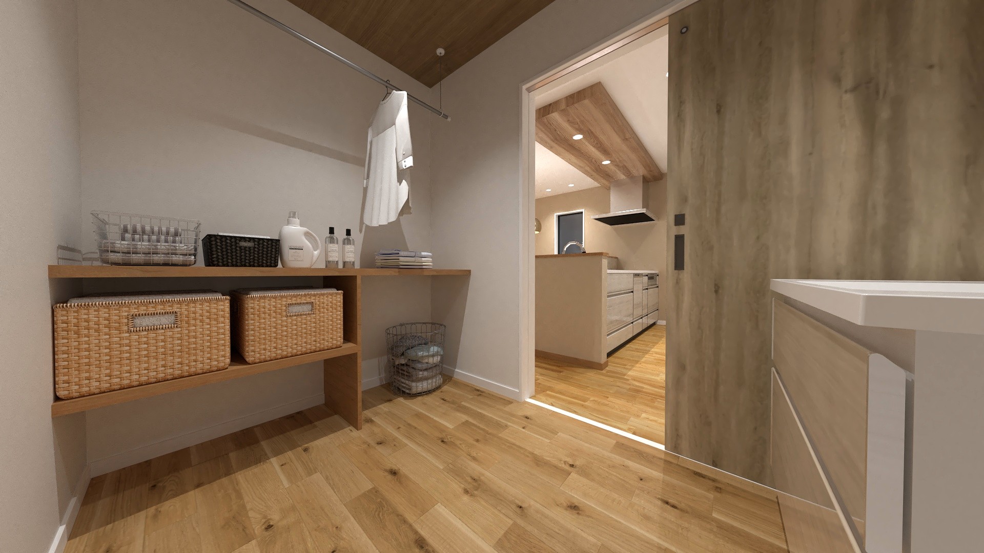 暮らしの質を上げる「家事ラク」動線 キッチン横のパントリー、ベビーカーも入るシューズクローク、そして室内干しが可能な広々とした洗面脱衣室。さらに、奥行きのあるバルコニーは、少しの雨や桜島の灰からも洗濯物を守ってくれる頼もしい味方です。