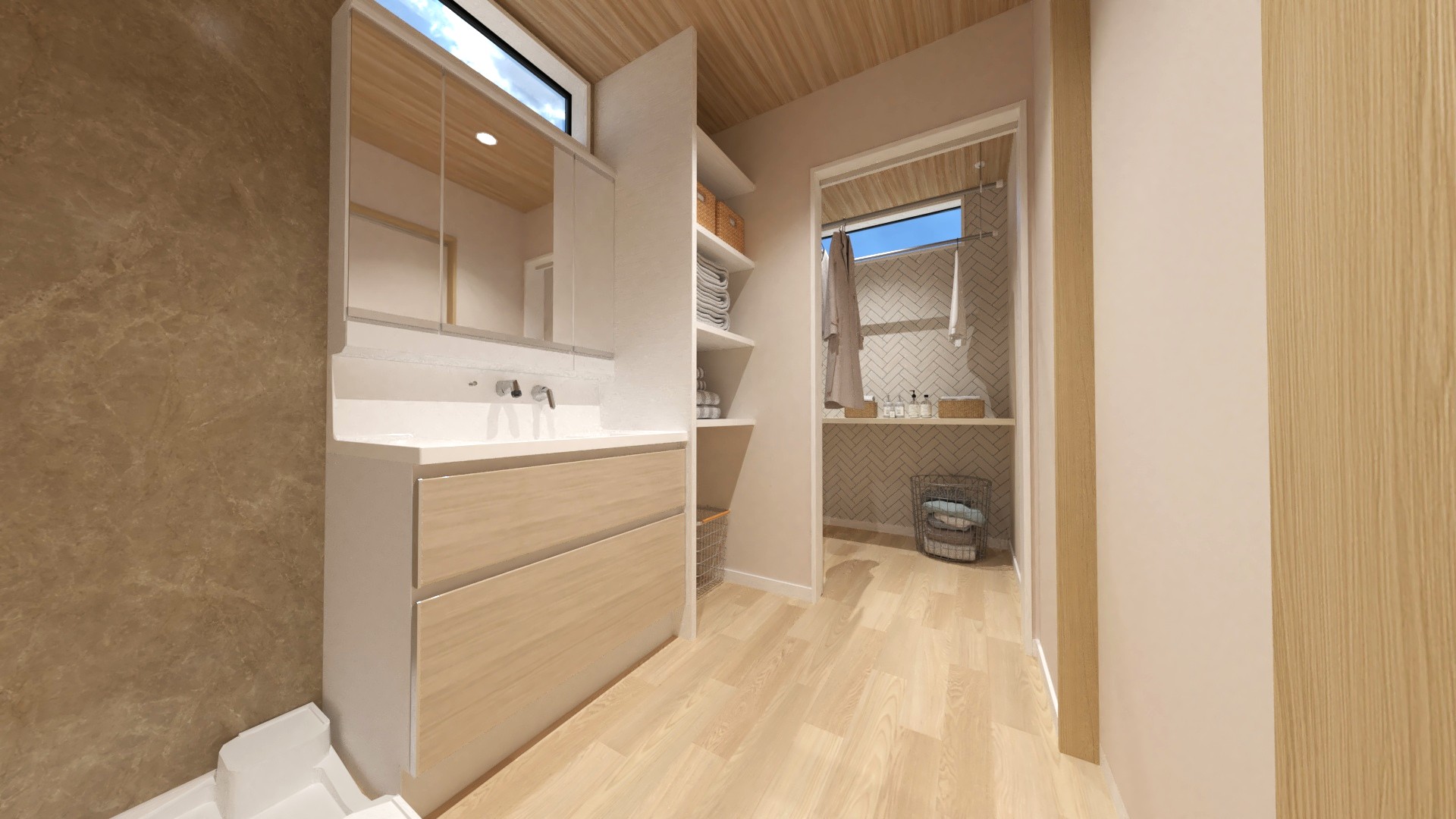 キッチン、洗面脱衣室、そしてサンルームの繋がりが、忙しい毎日の家事負担をグッと軽減できるラク家事動線!