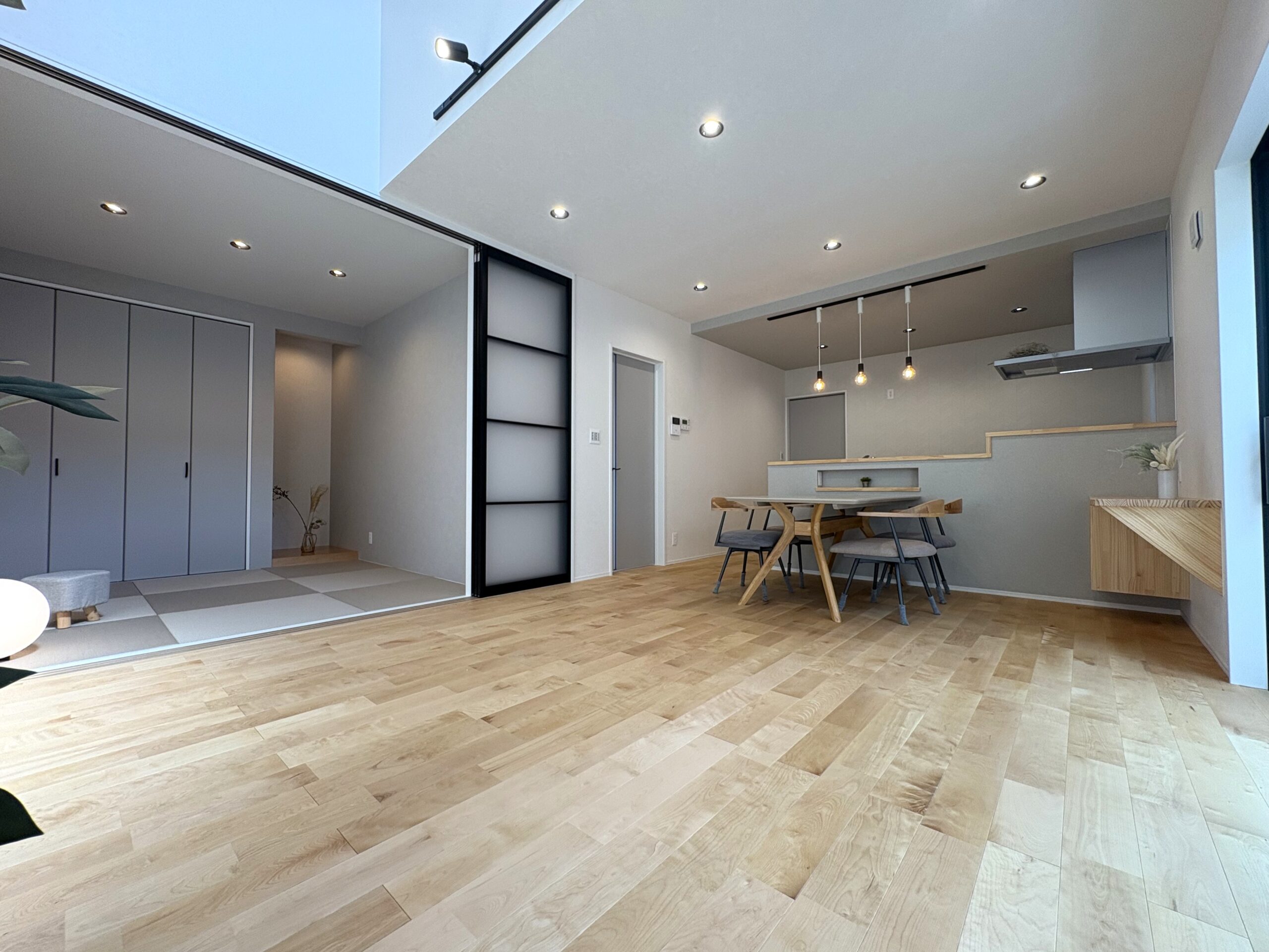 和室は家族がまったりと過ごせる安らぎの空間。畳なので転んでも安心!お子様の遊び場やお昼寝の場所としても最適です。お布団もしっかり収納できるクローゼット付き!