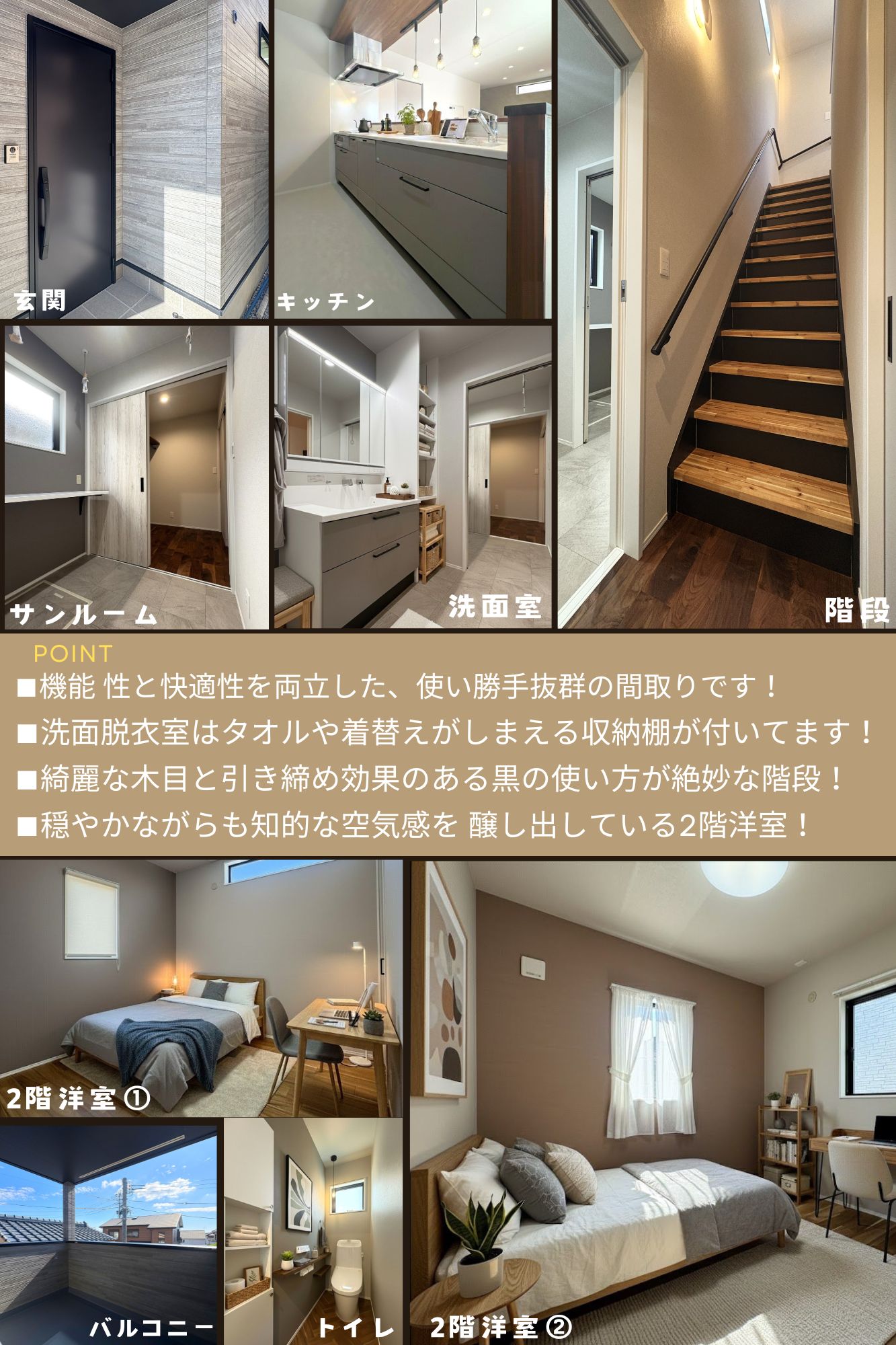 他の2階洋室は深みのある濃淡のコントラストが美しい床材を採用し、お部屋に奥行きと洗練されたモダンな雰囲気を演出。トーンを抑えた壁紙との調和が、心地よい安らぎのハーモニーを奏でます。