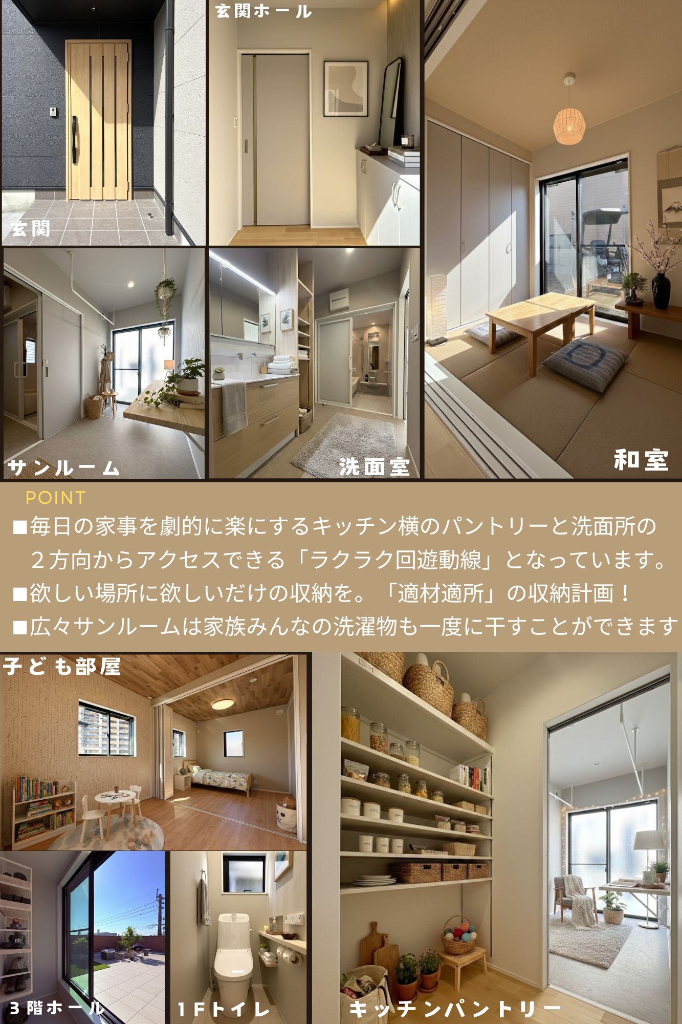 毎日の家事を劇的に楽にするのが、キッチン横のパントリーと洗面所の2方向からアクセスできる「ラク家事動線」中心にある3帖の広々サンルームは、急な雨でも安心の室内干しスペース。折りたたみ式の作業台付きで、アイロン掛けや洗濯物を畳む作業もその場で完結します。