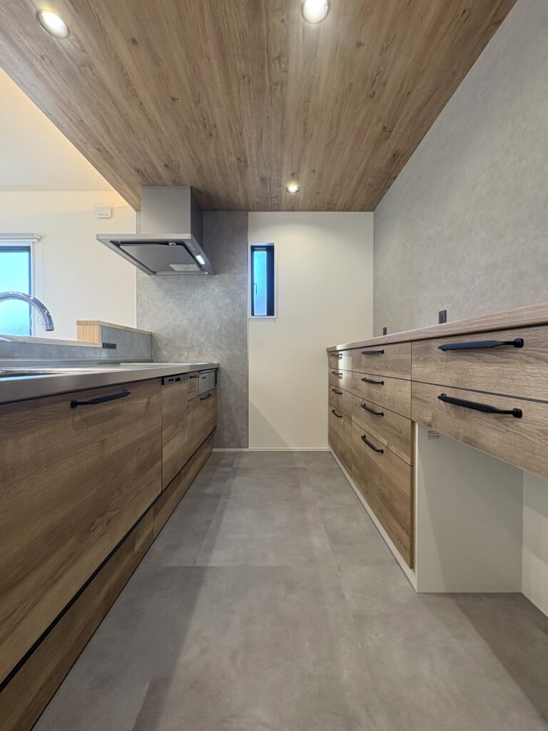 ■木目の天井と扉で統一し、落ち着いた雰囲気のキッチン。