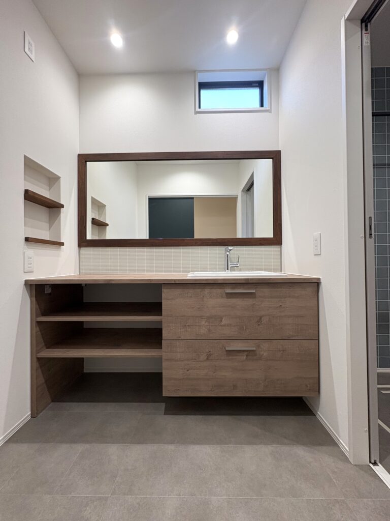 ■木目と大きな一面鏡が印象的な洗面所。朝の身支度も気持ちよくできそうです。