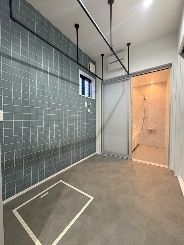 ■ブルーグレーのタイル調クロスとダークトーンの床がかっこいい脱衣室。室内干しもでき、家事がはかどりそうです。
