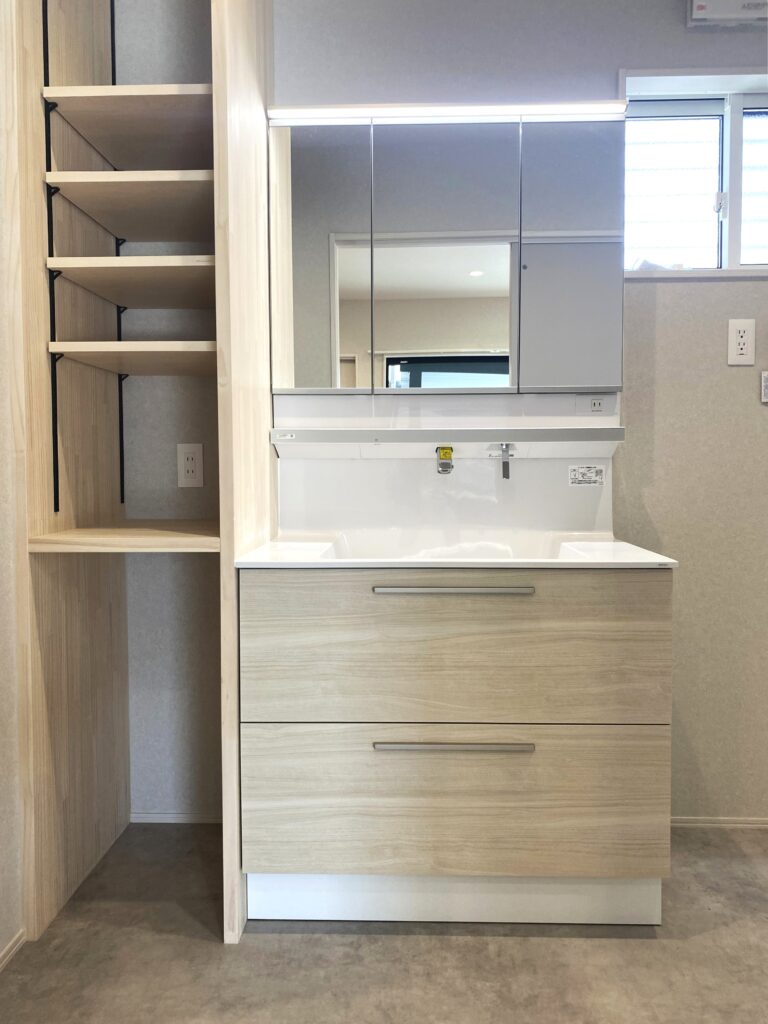 あえて「鏡なし」を選択することで、お掃除の手間を省き、見た目もスッキリと仕上げました。