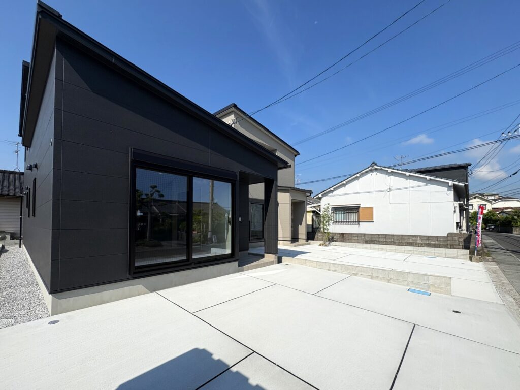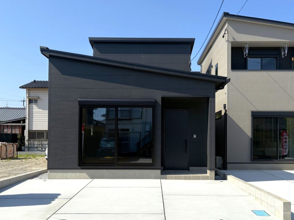 柔らかいブラックのフラットサイディングとディープグレイのドアで飽きのこないシンプルな外観。奥行きのある建物のシルエットが際立ちます。
