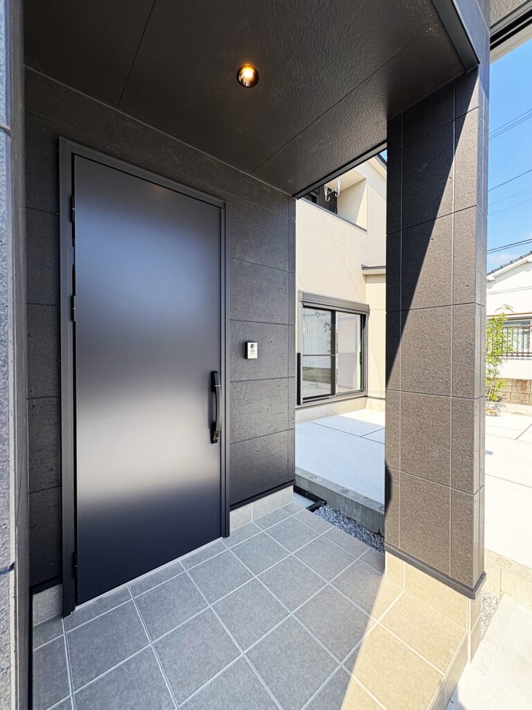 外観のシンプルさを引き立てる、重厚感のある玄関ドア。深みのあるグレーがエントランスに静かな存在感を与えています。