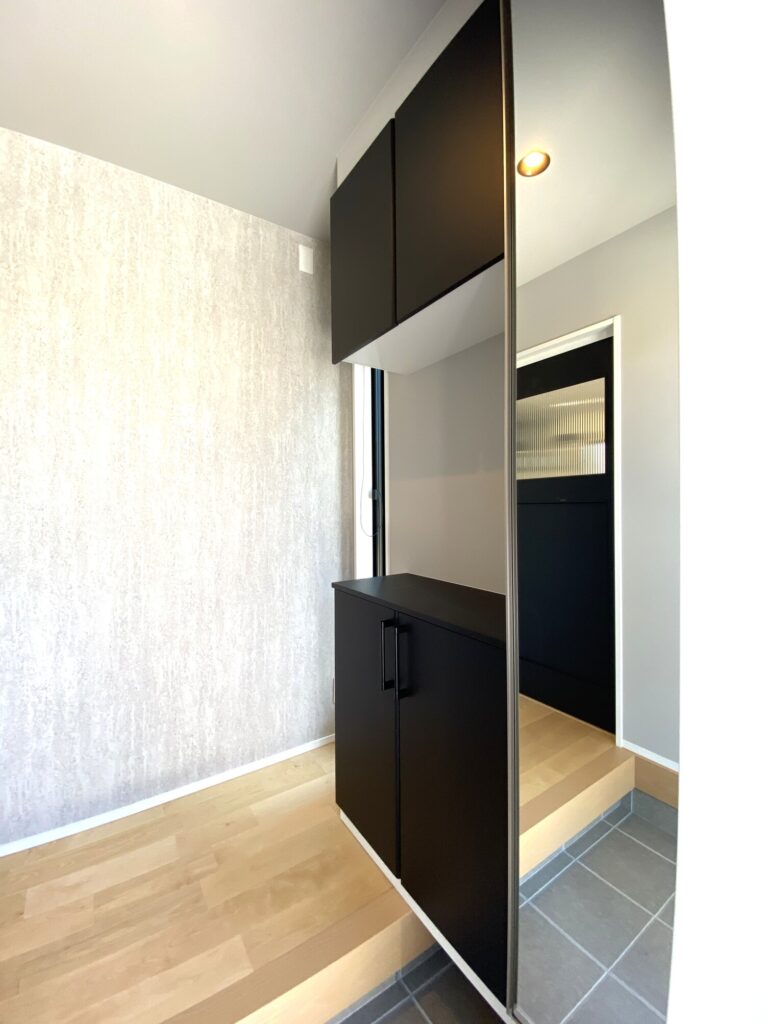 シンプルな雰囲気を一貫し、玄関収納もブラックで統一。