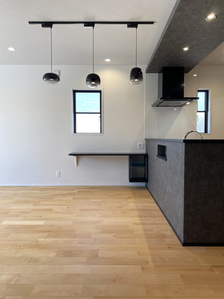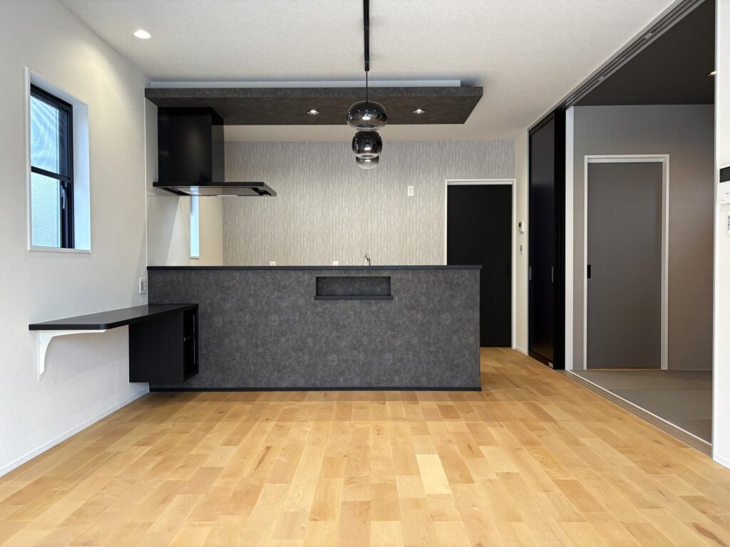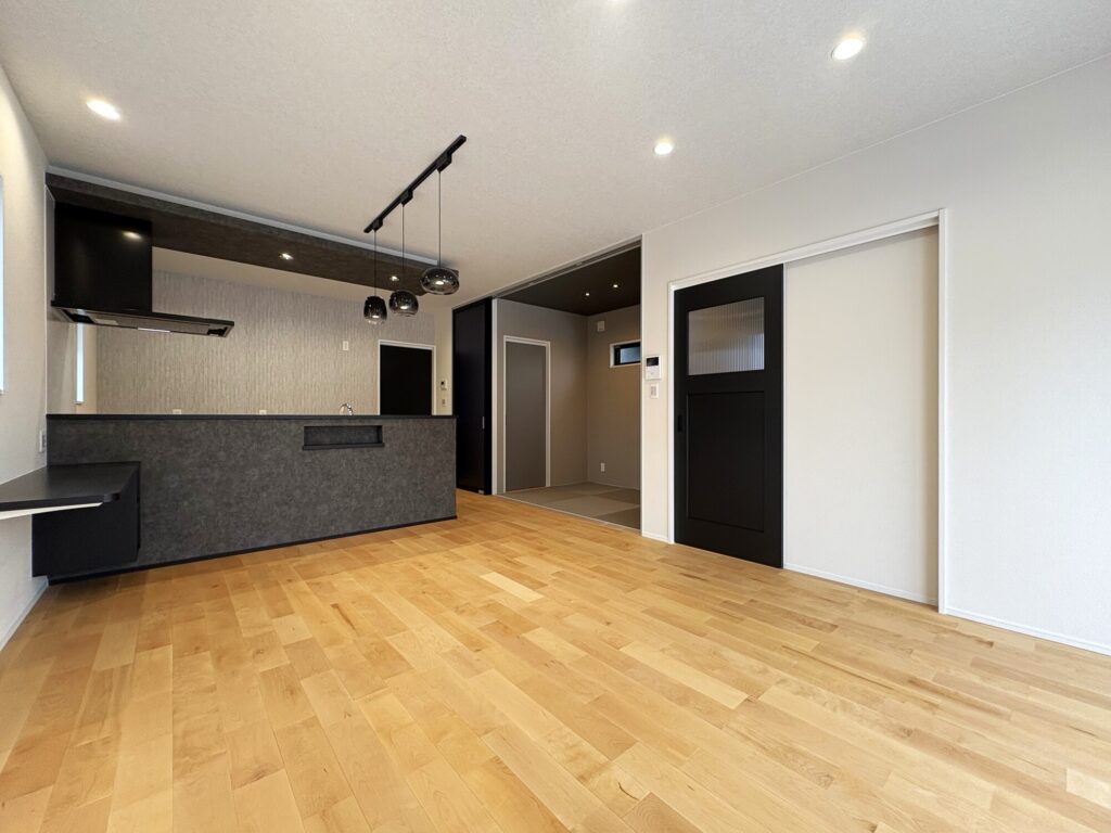 無垢床の温もりとブラックのシャープさを掛け合わせたLDK。すっきりとしたデザインで、日常を心地よく彩ります。