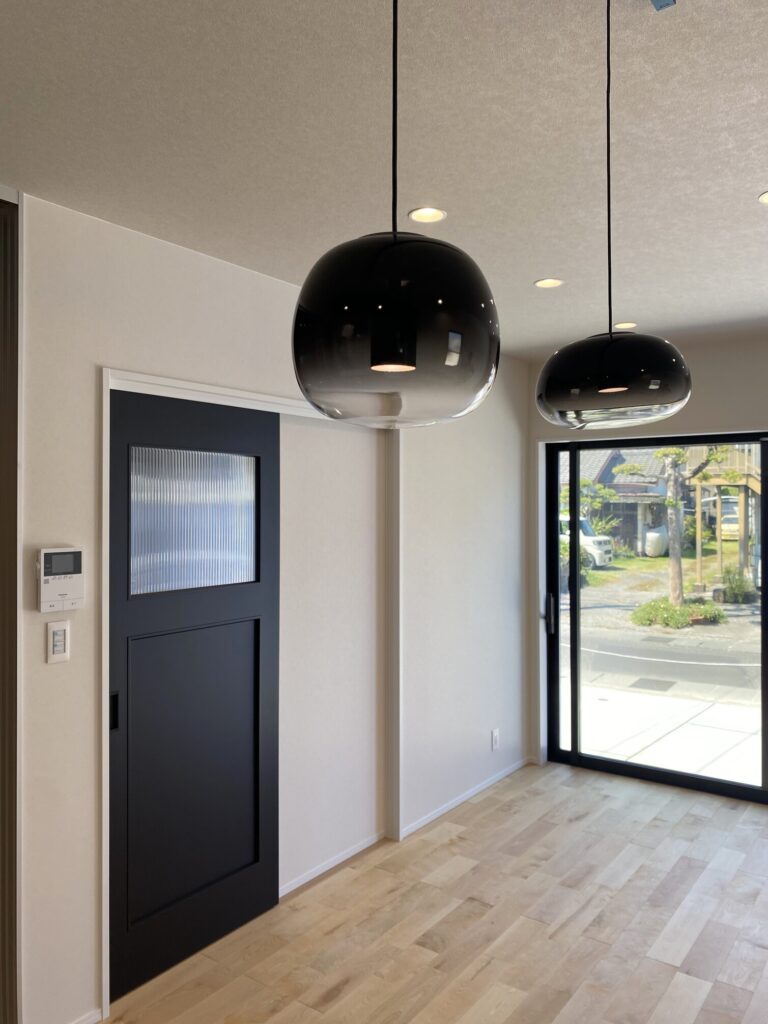 艶感のある黒のペンダントライトや透け感ある黒いパーテーションがラグジュアリー感を添えます。