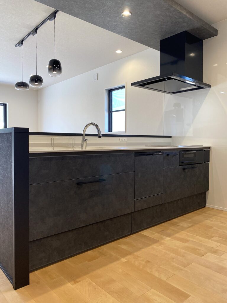 LIXILのキッチンは標準でブラックのレンジフードが選べるので、ブラックスタッコの扉色ともよく合います。