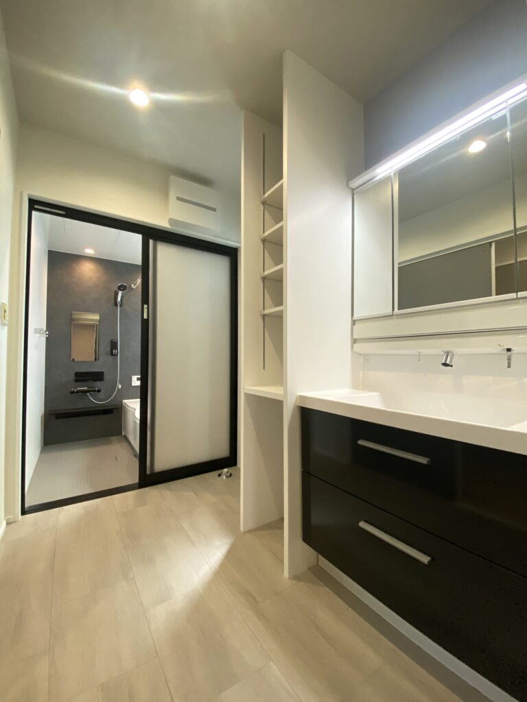 ディープグレーの扉色を採用し、落ち着きと清潔感を兼ね備えた洗面室。