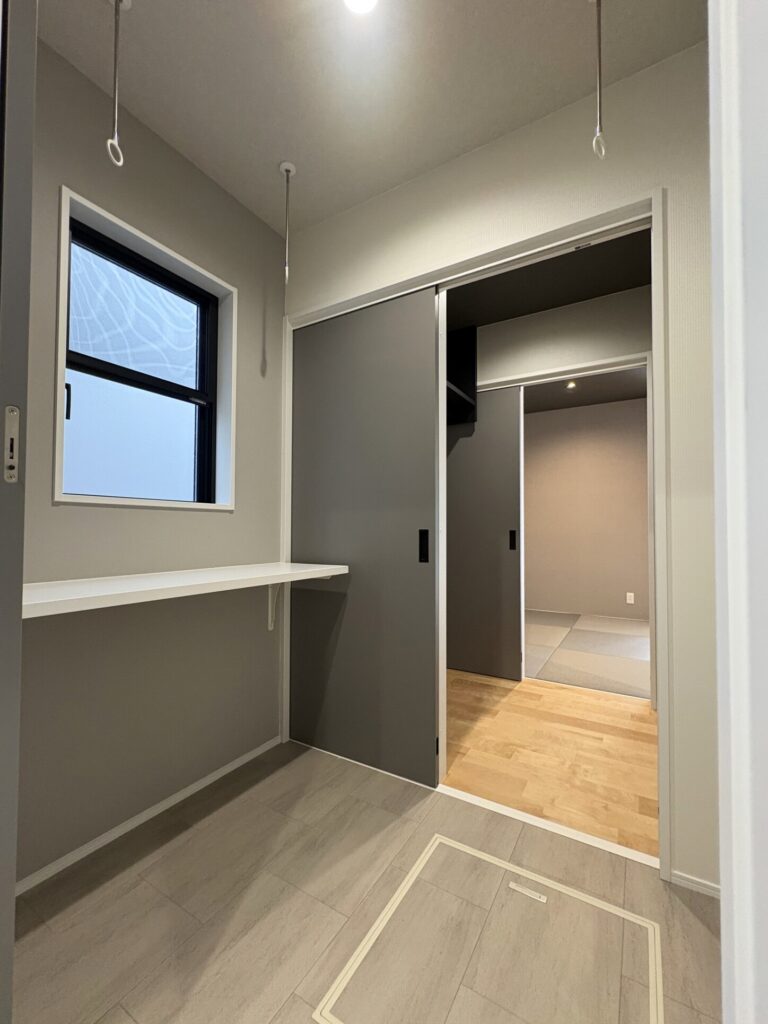 洗面室横に設けたサンルーム。グレー基調の清潔感ある空間で、室内干しもストレスなくできます。