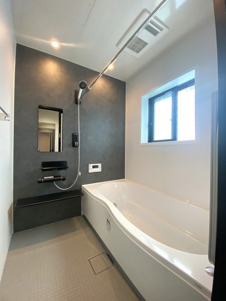 落ち着いたブラックのアクセント壁が映える、シックな浴室。ゆったりとした浴槽で、毎日のバスタイムを快適に過ごせます。