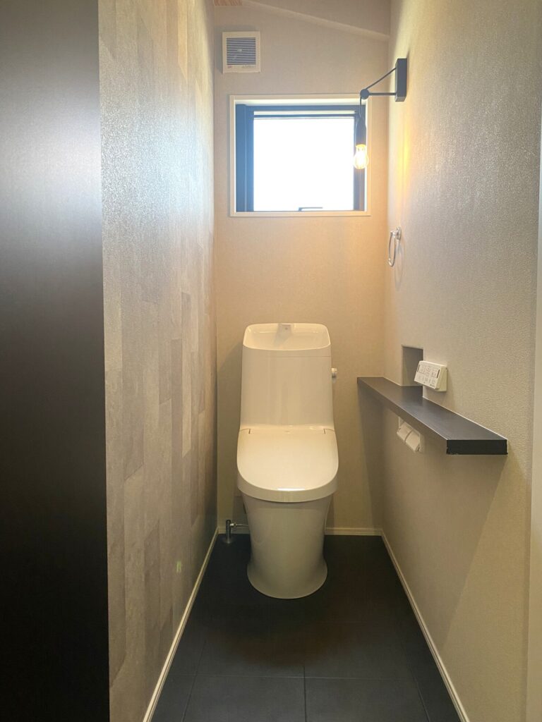 モルタル調のタイルのクロスと垂れ下がりタイプのブラケットライトがノスタルジックなトイレ空間。