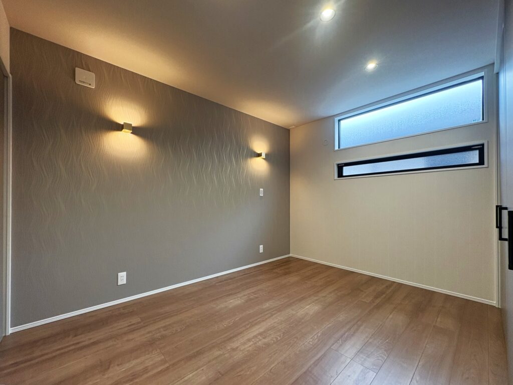 落ち着いた雰囲気の主寝室。シックグレイジュの建具色に合わせたアクセントクロスを照らすブラケットの灯りが、くつろぎの空間を演出します。