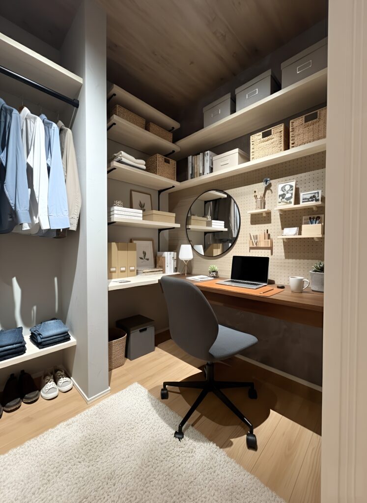 書斎スペースにはカスタマイズ自在な有孔ボードを取り入れ、趣味や仕事の道具をオシャレにディスプレイしながら収納できます。在宅ワークにもぴったりの空間ですね。