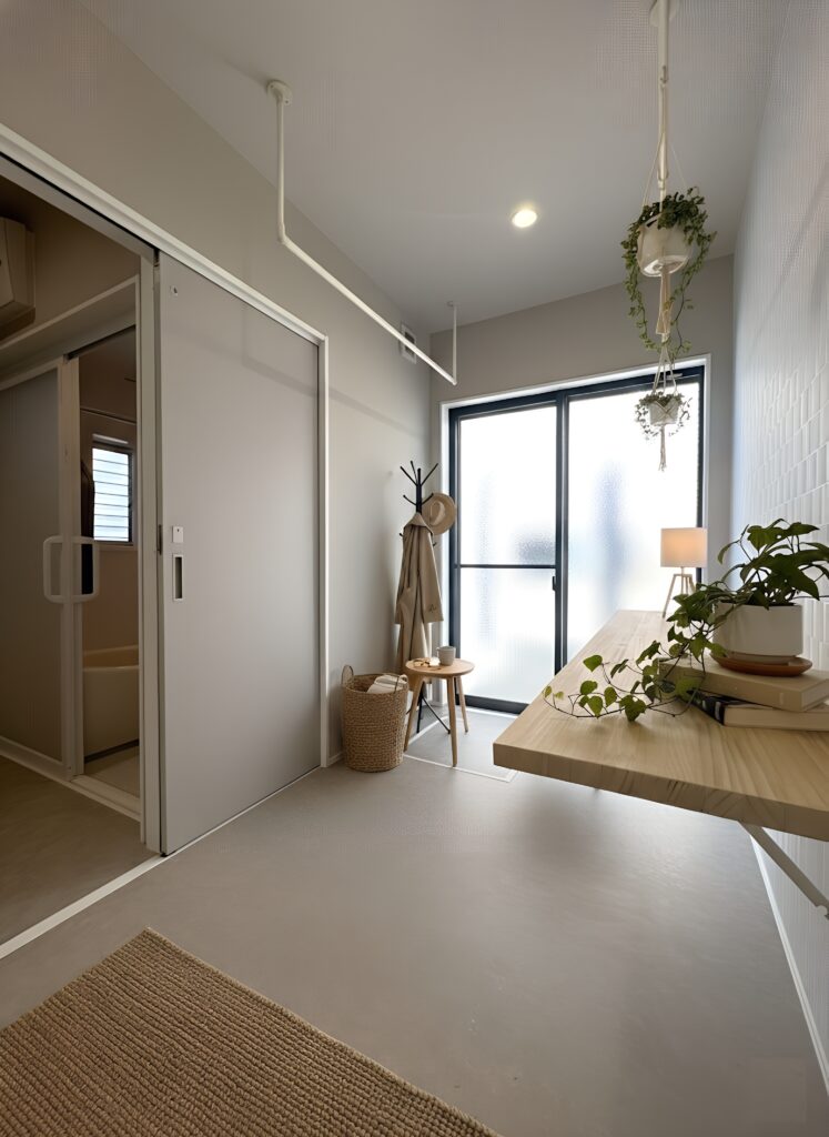 折りたたみ式の作業台付きで、アイロン掛けや洗濯物を畳む作業もその場で完結します。共働きのご家庭には特に嬉しい設備ですね。