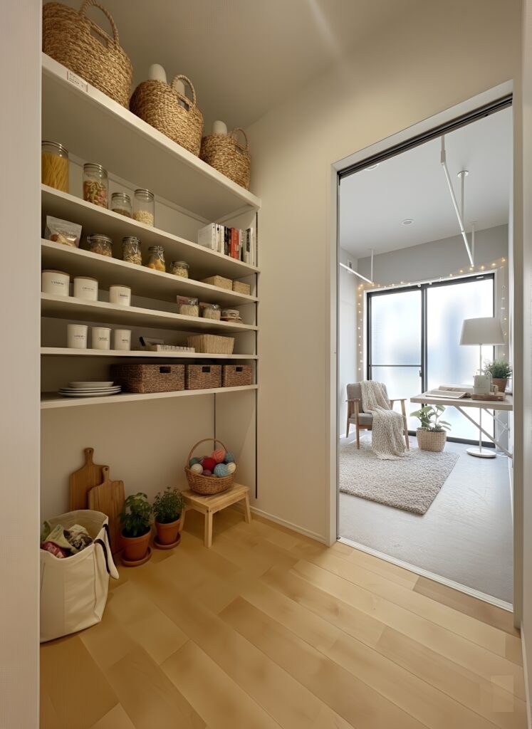 食品庫(パントリー)とサンルームが隣接しているので、買い物から収納、家事までの流れがとてもスムーズです。かじ