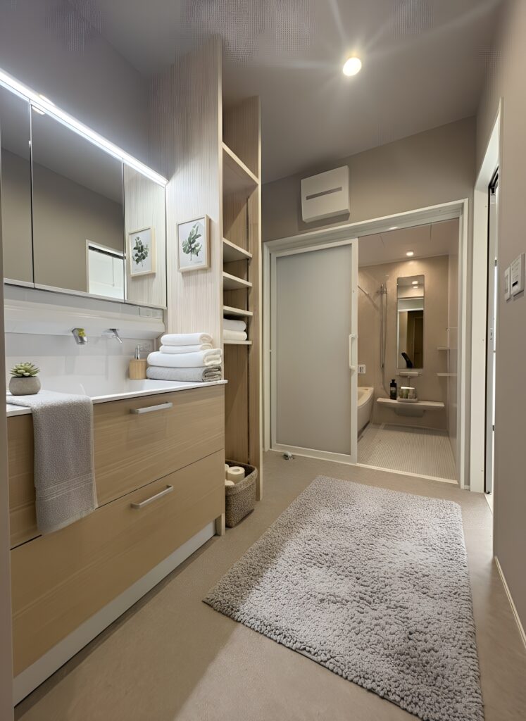 洗面室は明るく清潔感のある空間に。収納棚も充実しているので、タオルや日用品もすっきり収まります。