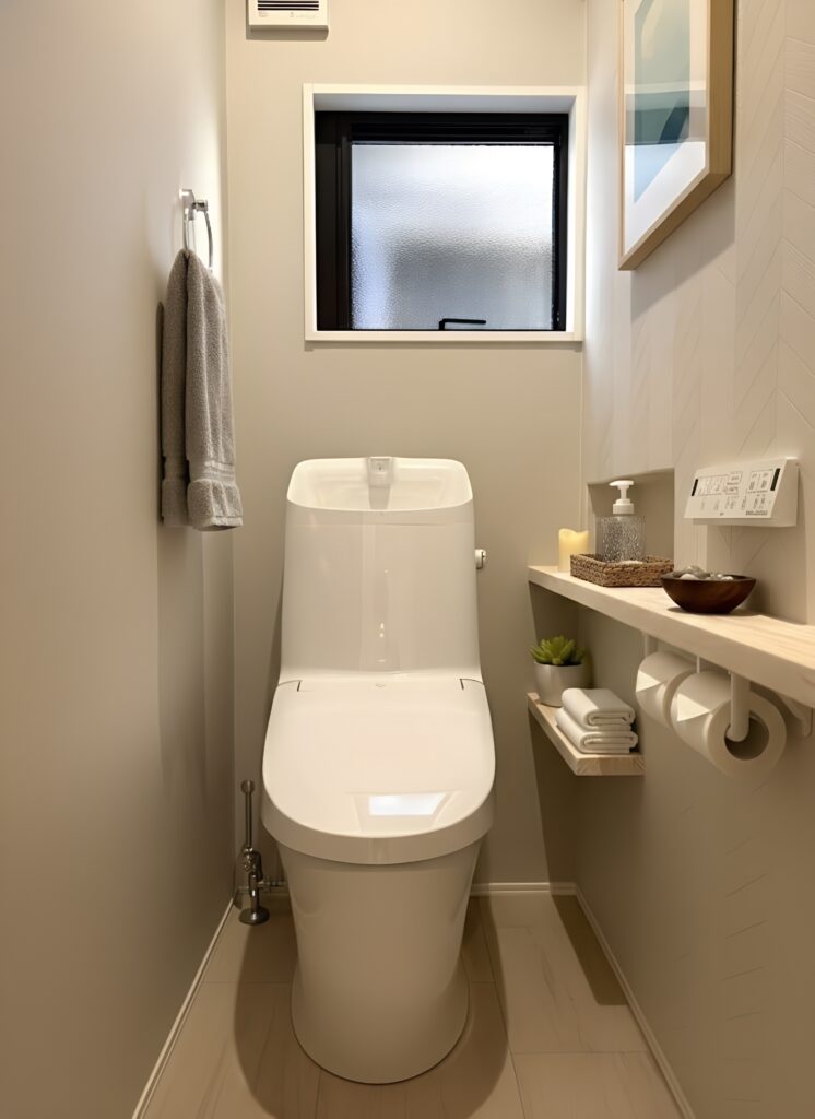 トイレはシンプルながらも機能的に。清潔感のあるホワイトを基調にまとめました。