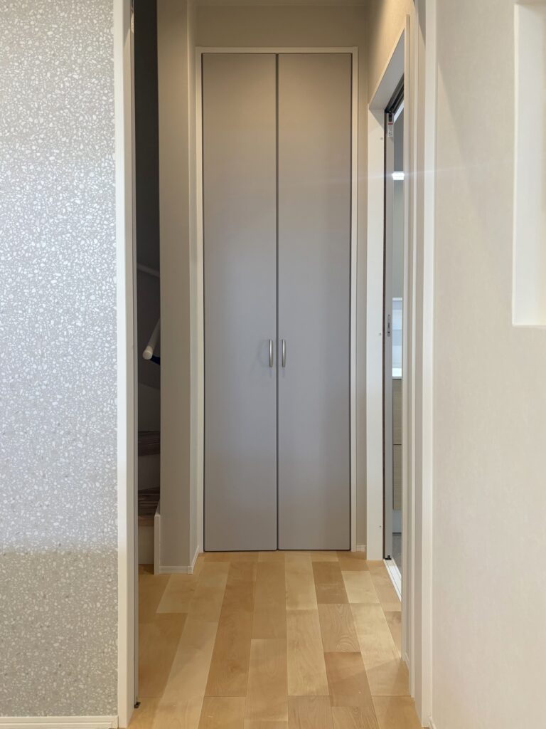 1階の廊下には大容量の収納を完備。掃除道具や日用品のストックなど、サッと取り出せる場所にあると便利ですよね。