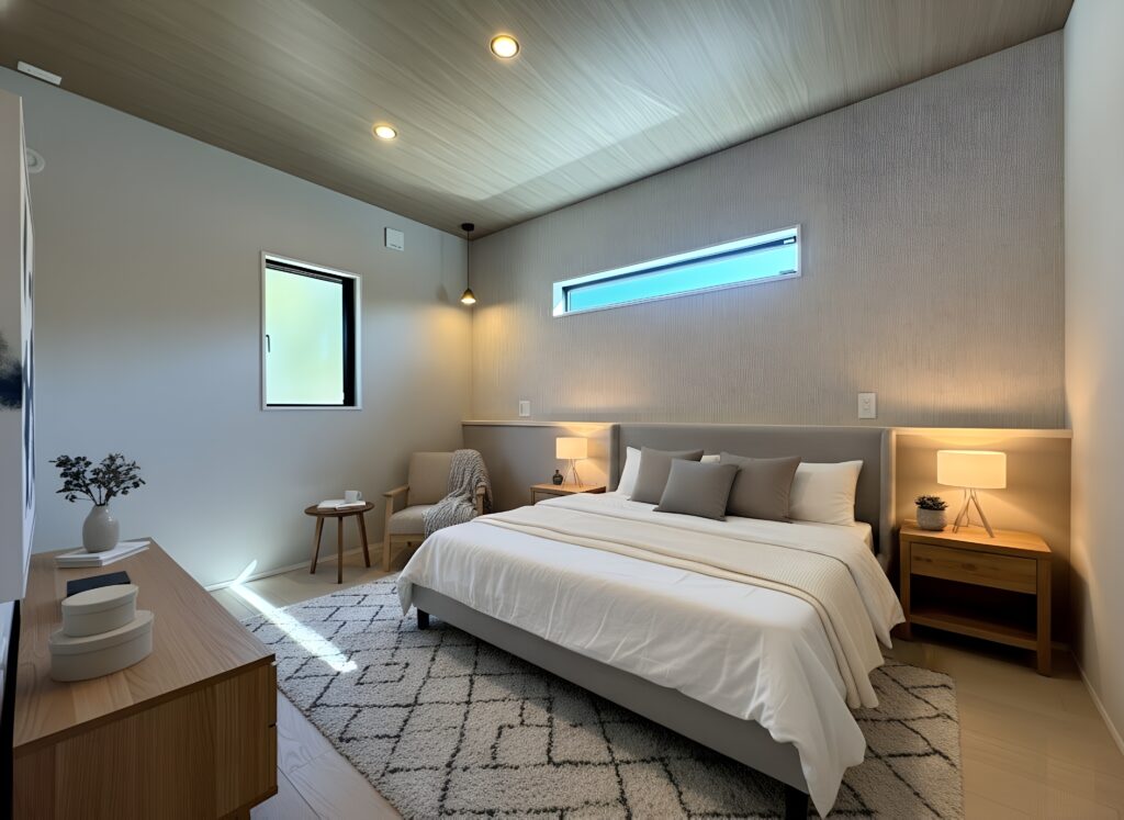 主寝室は落ち着いたトーンでまとめ、ゆったりと休める空間に。