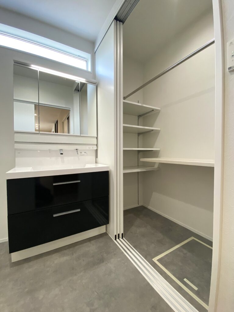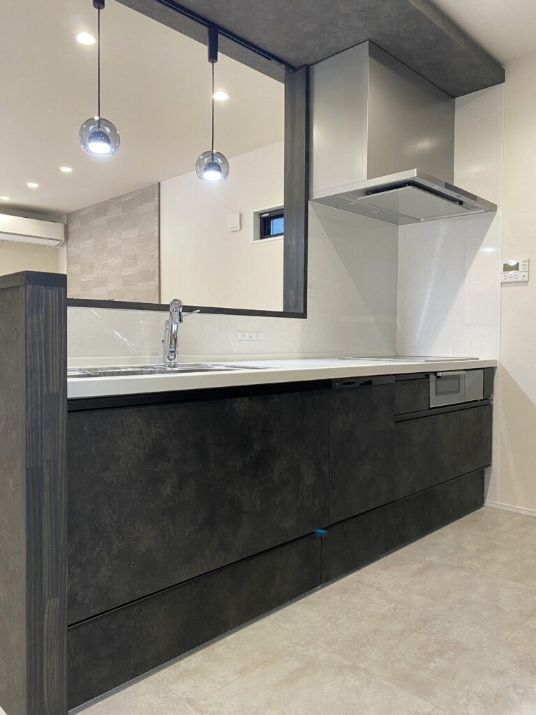 キッチン・洗面化粧台・ユニットバスも、ブラックとホワイトで統一。