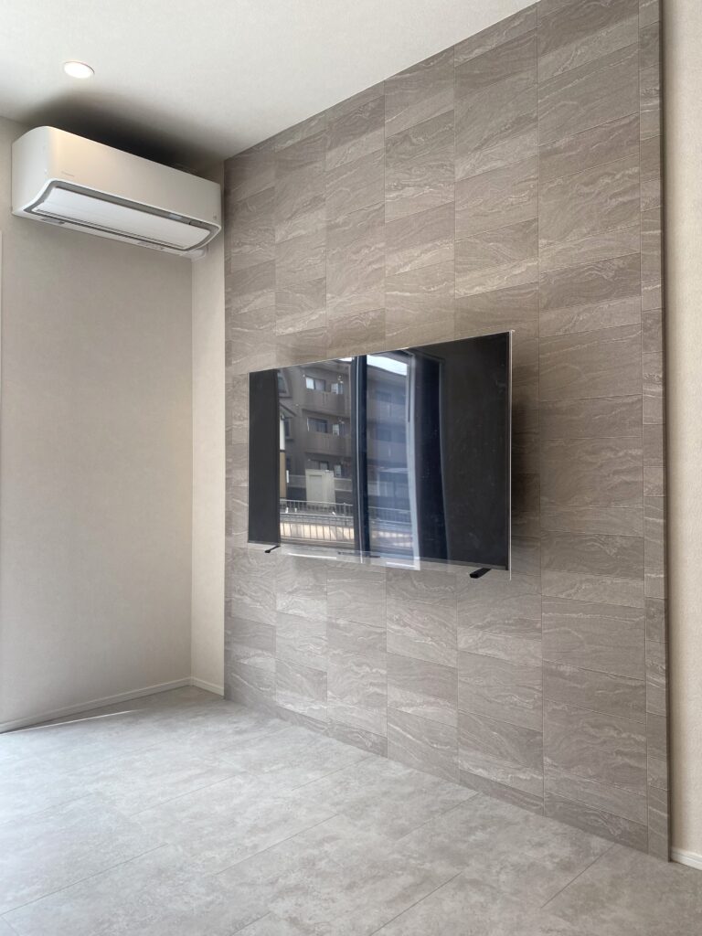 TVボード背面には、大理石調のアクセントクロスを取り入れ、高級感をプラス。