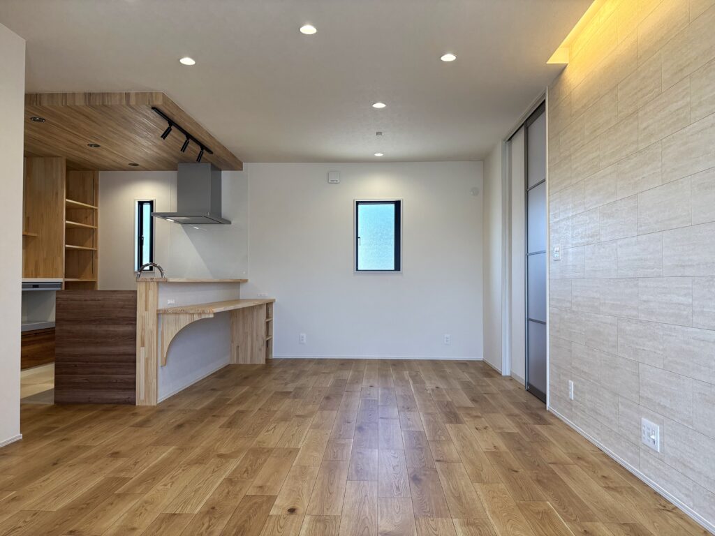 白を基調に、やさしい木目のコントラストが心地よいLDKは、明るく清潔感のある空間。