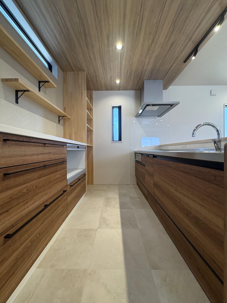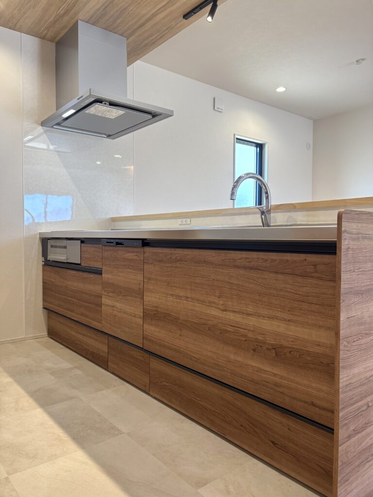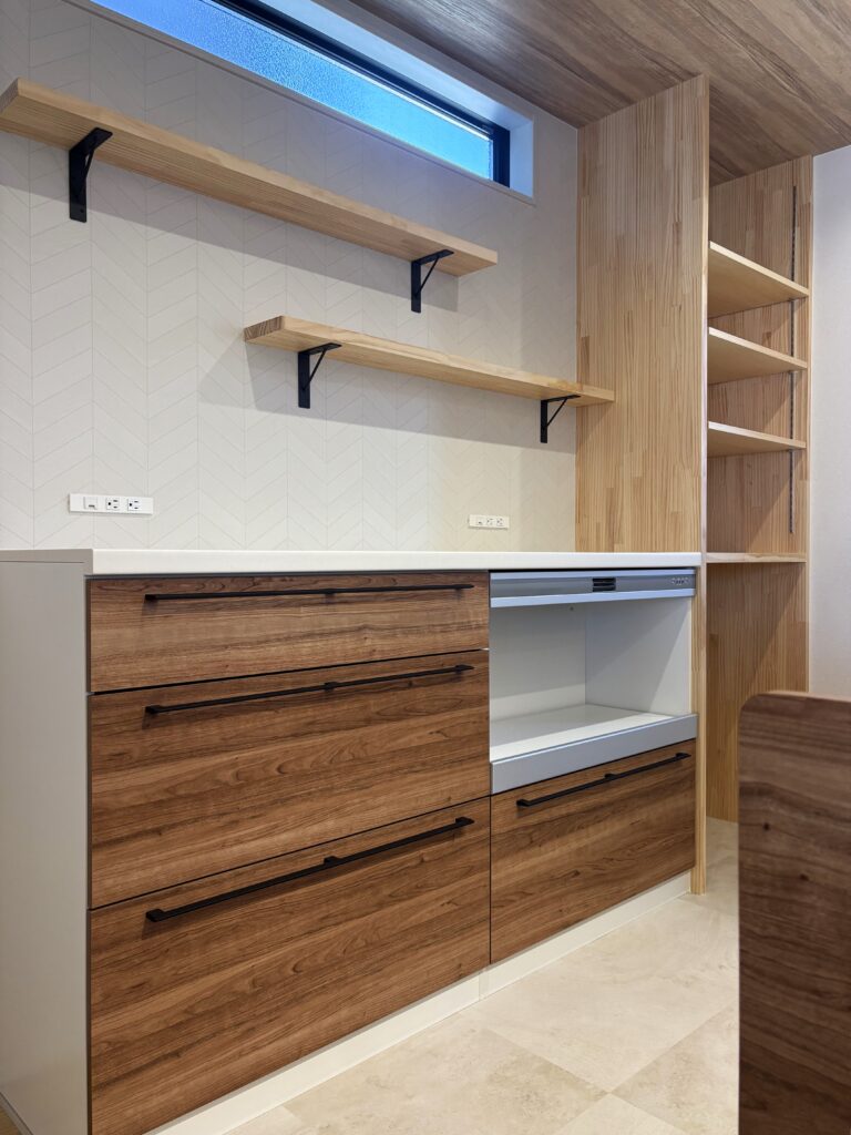 ショールームで一目惚れしたという木目調のキッチンとカップボードで統一し、機能性とデザイン性の両立を叶えました。
