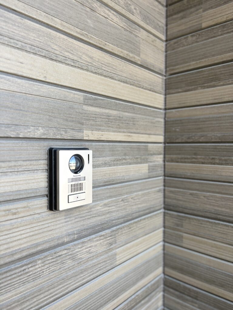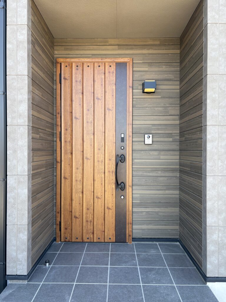 玄関ドアの木目と、その周囲に張り分けた木目調の外壁が、クールな印象の中にほどよい温もりを添えています。